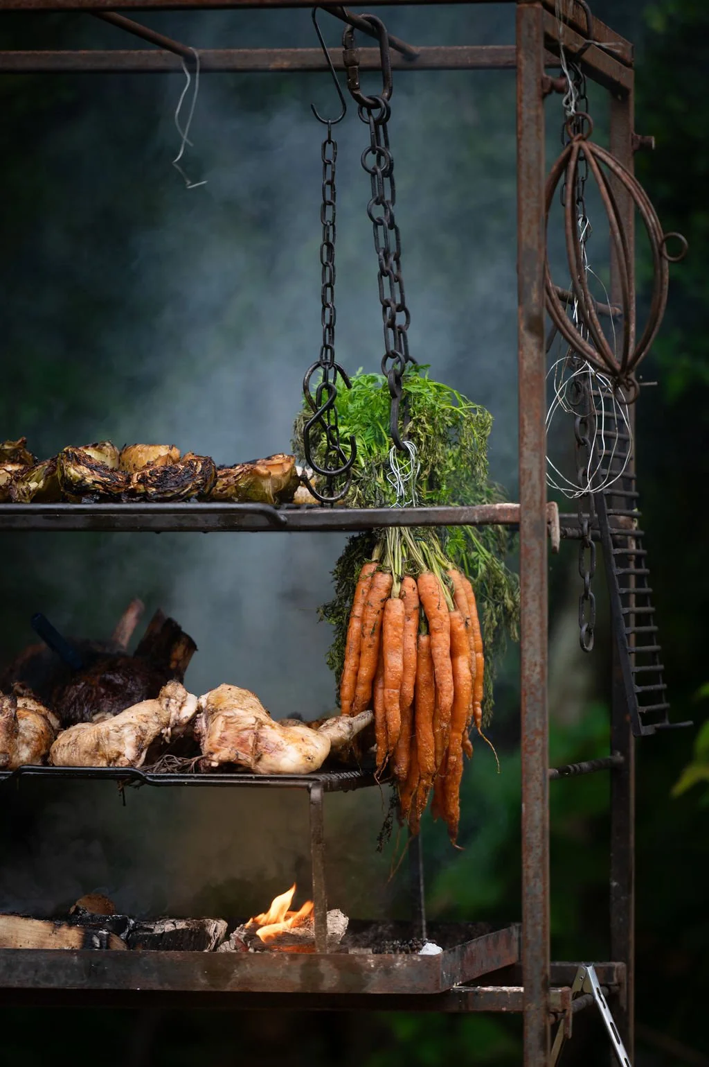 At 2pm, guests move into our canvas pavilion for the main event — a fire-cooked Sunday roast (pre-ordered in advance).